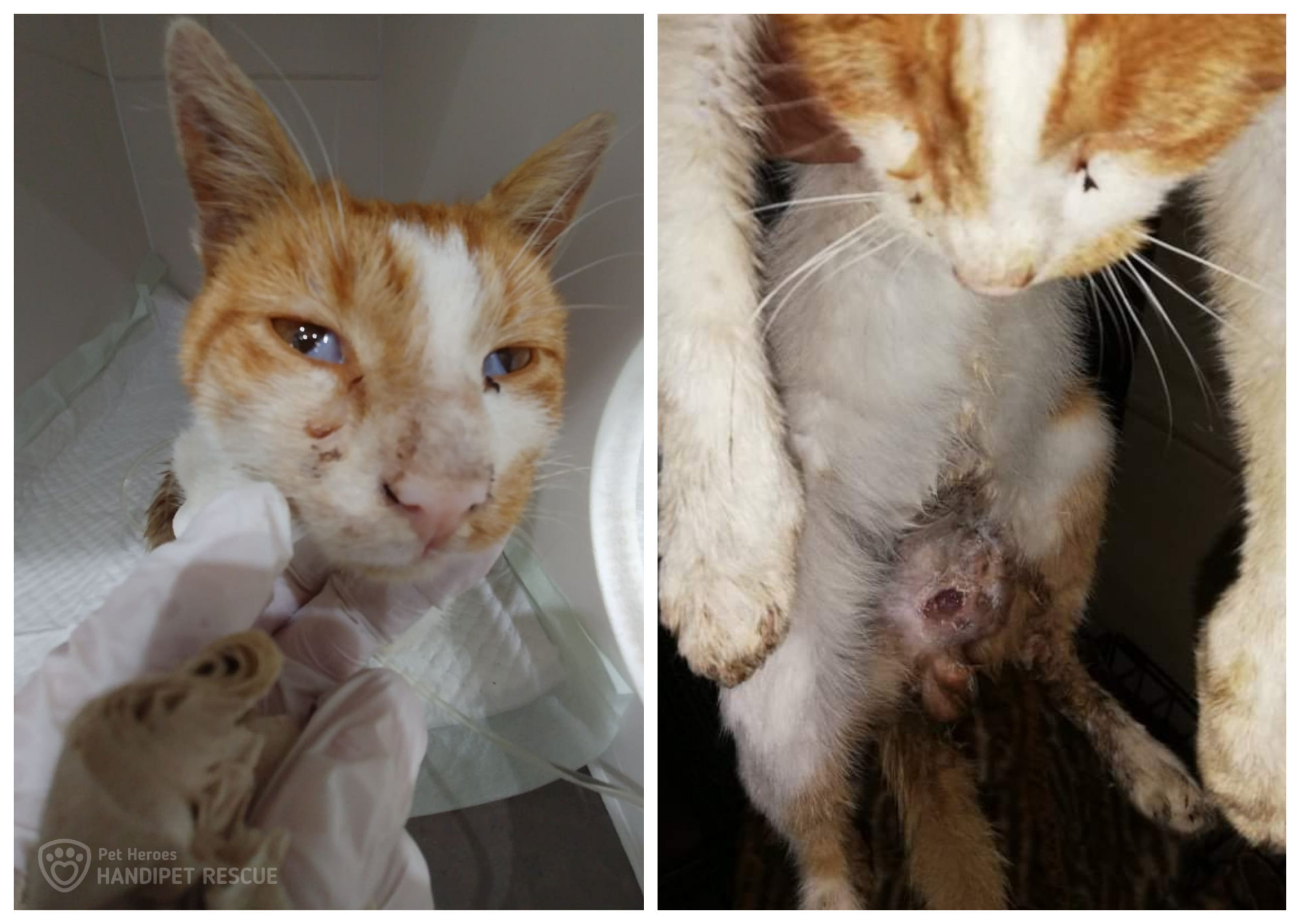 Vychrtlý, zablešený, svrab v uších, úplně bílý čumáček a na bříšku měl obrovskou otevřenou ránu. Kocourek byl hospitalizovaný na veterině a bojoval. Byl moc hodný a mazlivý. Bylo na něm vidět, že chce žít, ale jeho stav byl kritický. Moc jsme ale doufali, že to zvládne.