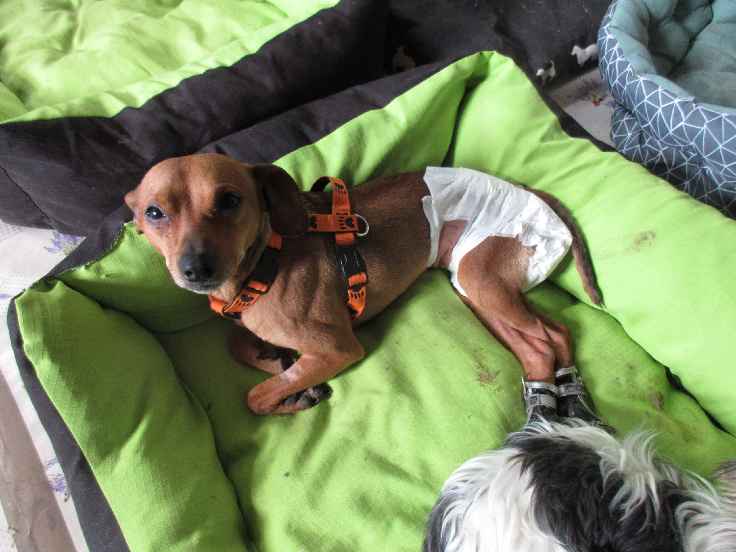 Barney sice musel ještě chvíli nosit límec a plenky, aby si nepoškodil stehy, ale zvládl to jako šikovný kluk. Bohužel ale ztratil na váze a ochably mu svaly kvůli tomu, že musel mít klidový režim.