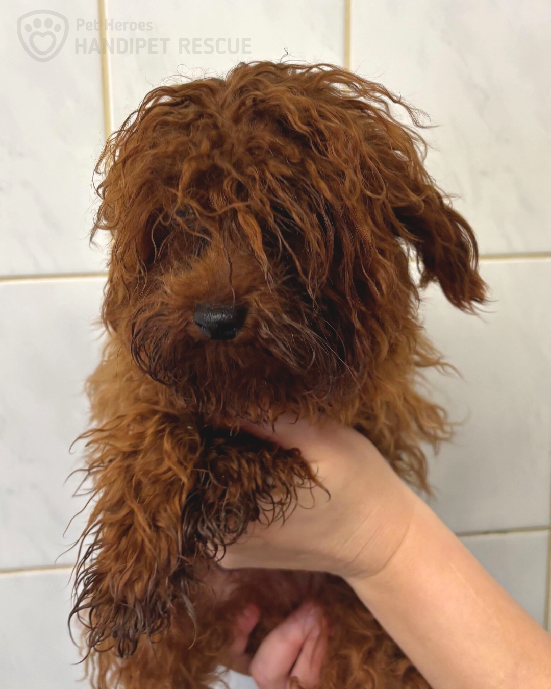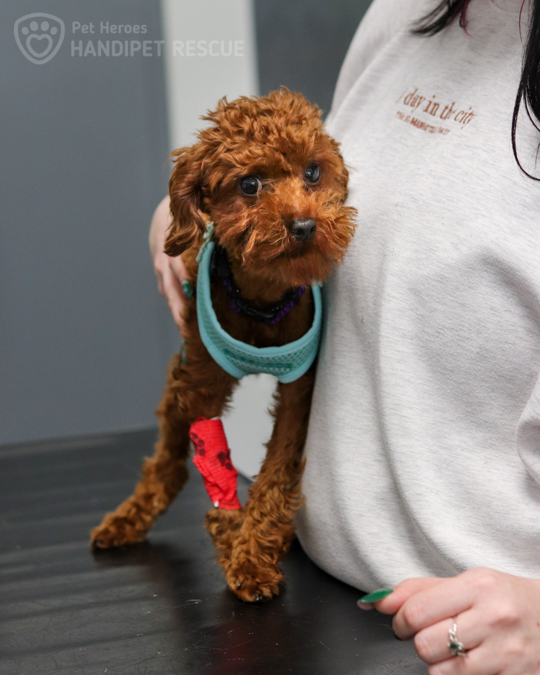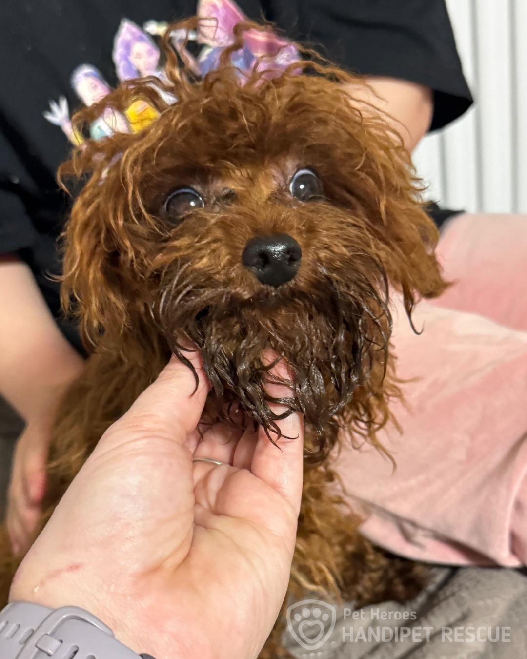 Štěně kříženec trpasličí pudl leží v náruči dočasné tety v čekárně na veterině.