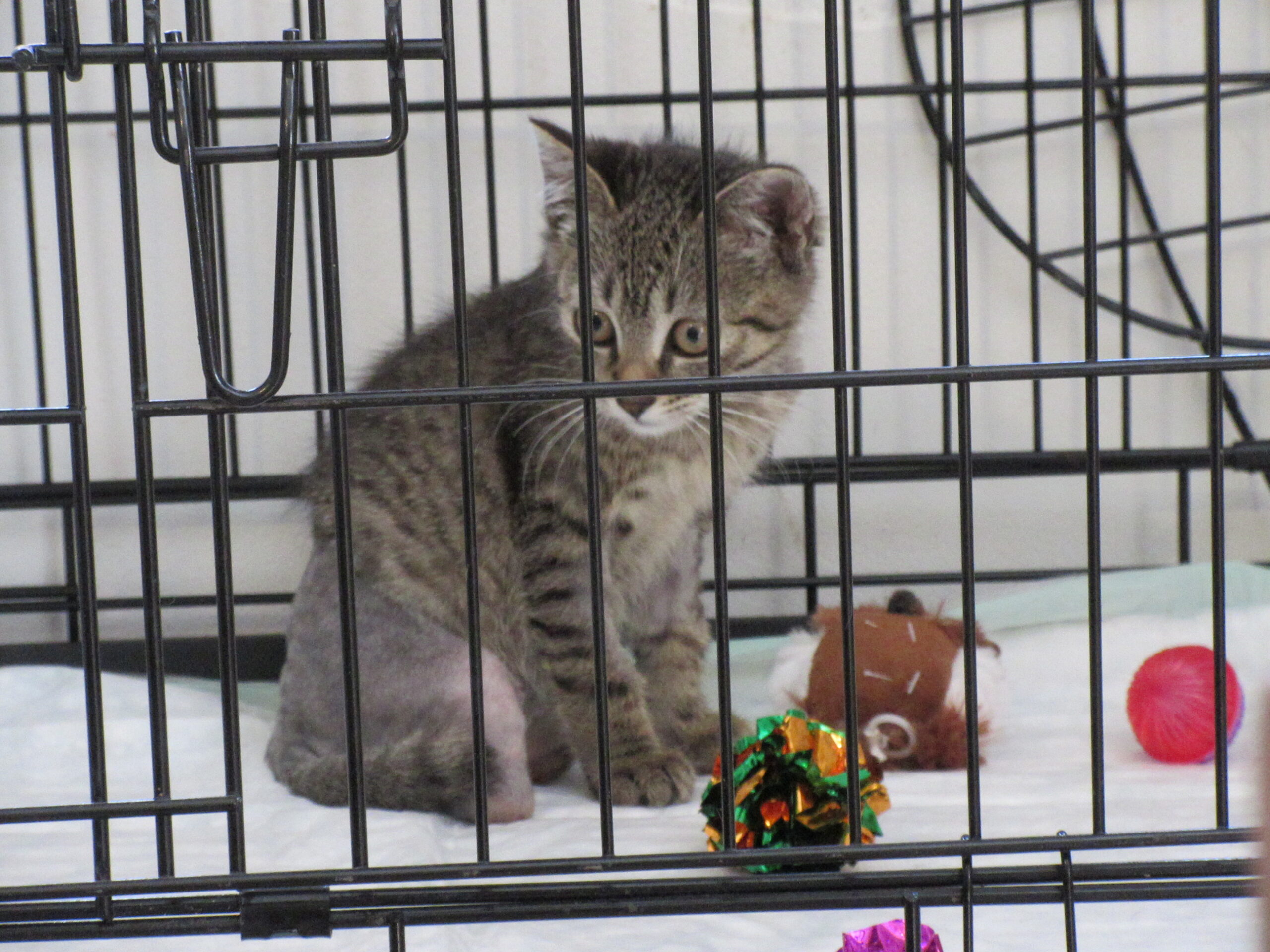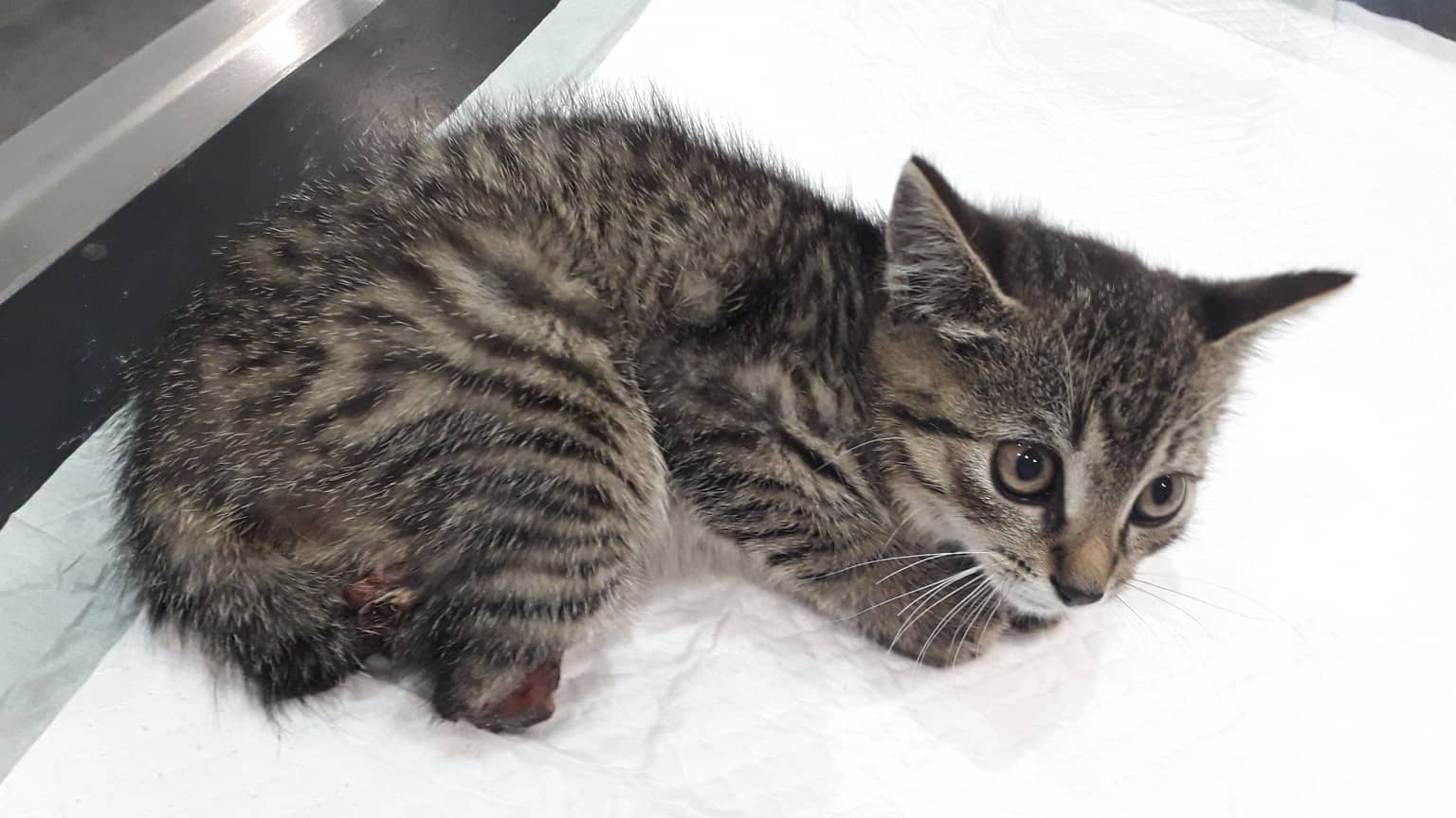 Mourovatý kocourek Mojito, který přišel o zadní nožičky