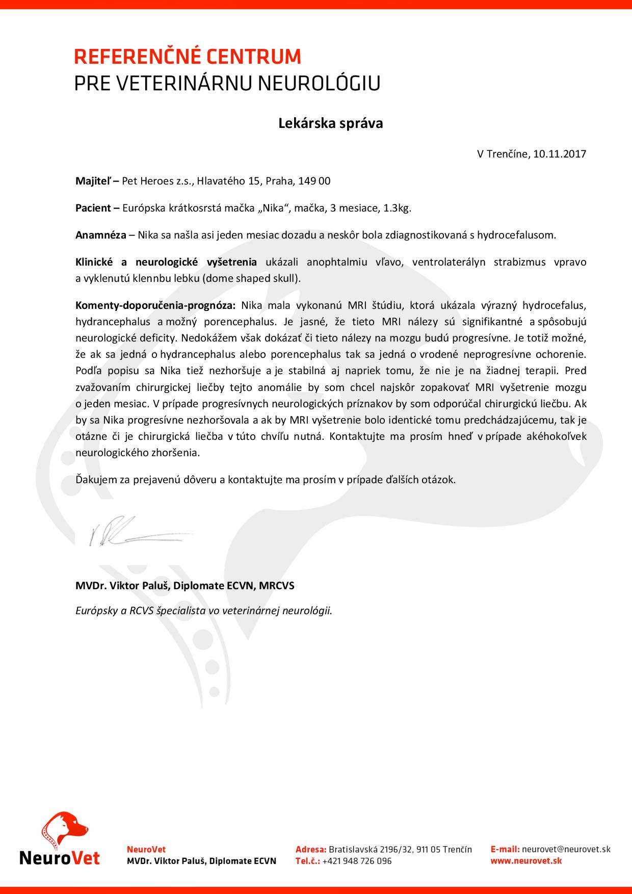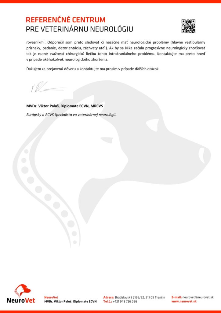 Původně to vypadalo, že je to způsobeno hydrocefalem – vznikem tekutiny, která nemá v hlavičce co dělat a že bude nutné, aby jí byla zavedena hadička, která dokáže tekutinu odčerpávat do těla, kde se o ni organismus postará. Poté, co podstoupila návštěvu u pana veterináře na Slovensku nám však vysvitla naděje, že Nika nebude operaci potřebovat.